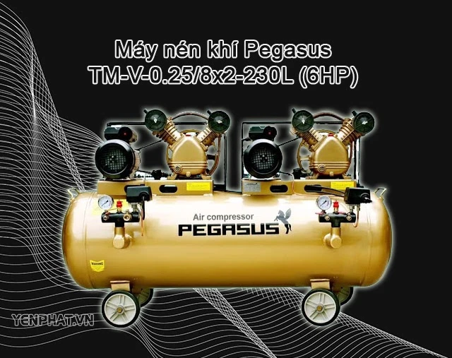 Pegasus được người tiêu dùng biết đến là thương hiệu sản xuất máy nén khí có tiếng tại Việt Nam. Mọi khâu sản xuất đều phải tuân thủ hết những yêu cầu khắt khe về kỹ thuật cũng như tính thẩm mỹ. Chính điều đó đã góp phần mang đến cho khách hàng những sản phẩm được đánh giá cao về chất lượng, mẫu mã. Hơn nữa còn được ưa chuông nhờ vào khả năng tiết kiệm năng lượng suốt quá trình vận hành. Gây ấn tương nhiều nhất đối với người tiêu dùng phải nhắc đến máy nén khí Pegasus TM-V-0.25/8x2-230L (6HP).