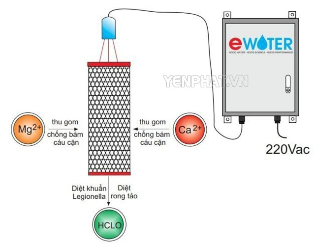 Theo đó, Ewater xử lý cáu cặn bằng điện từ trường và áp dụng định luật Vật lý để tạo ra một trường điện từ cảm ứng trong lòng ống. Với tần số thay đổi liên tục từ 1,2 - 48 kHz, thiết bị Ewater sẽ cung cấp năng lượng thích hợp để ion hóa nước cùng các chất gây cáu cặn như Ca, Mg, Si, Fe, Mn,... làm cho những chất này mất đi khả năng bám dính ở trên đường ống.