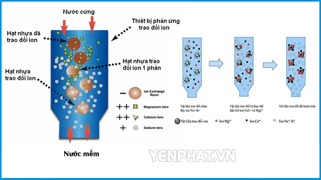 - Thay thế các ion gốc tự do gây hại cho hệ thống đường dẫn nước bằng ion vô hại; các hạt nhựa sẽ trao đổi ion se loại bỏ chất khoáng không cần thiết ở trong nước.